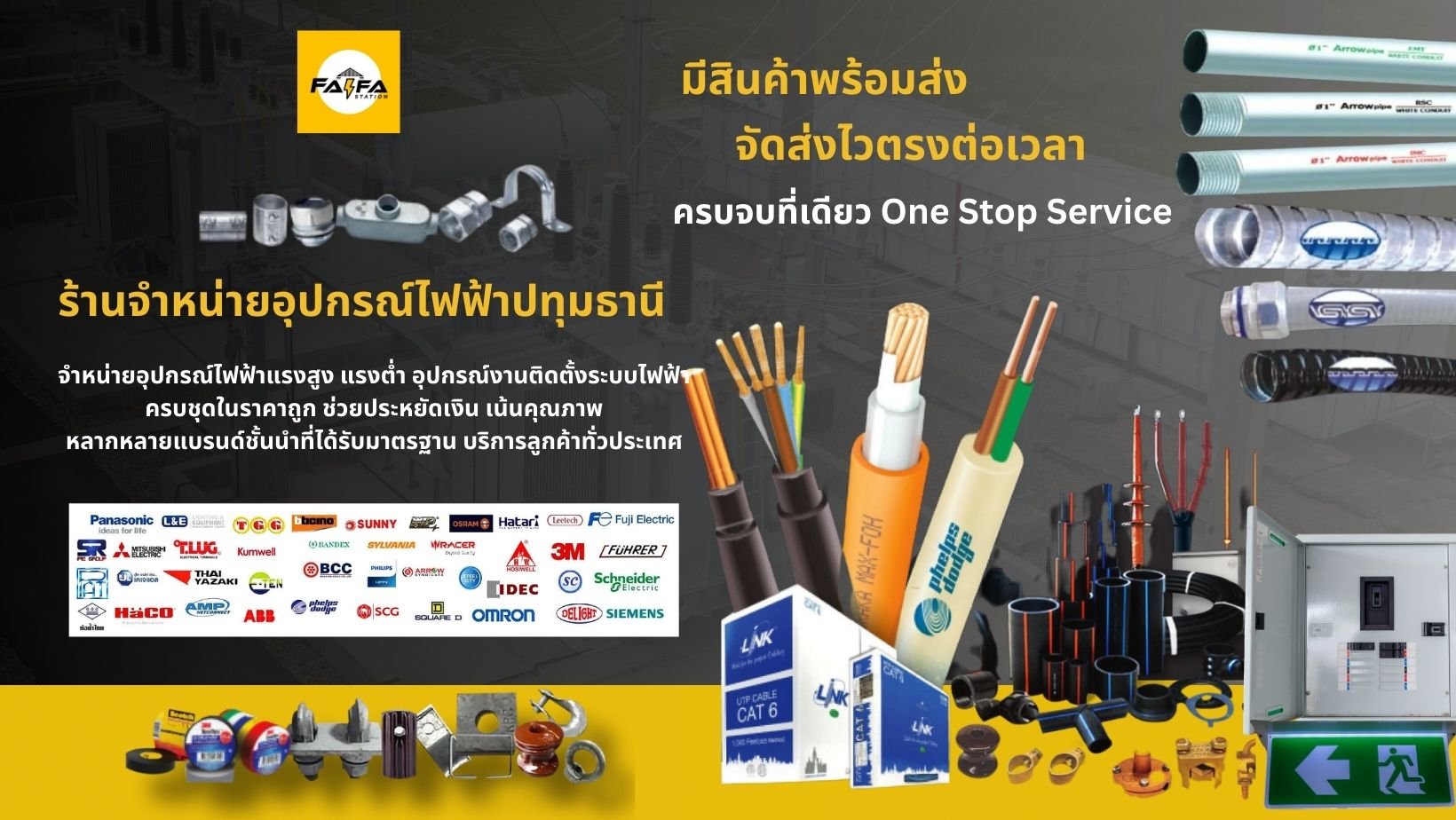 ศูนย์รวมสายเคเบิ้ล สายไฟทุกแบบ ท่อร้อยสายไฟ อุปกรณ์ฟิตติ้ง อุปกรณ์ติดตั้งสายไฟในอาคาร ราคาส่งจากโรงงาน มีของครบไม่ต้องหาทีละร้านให้ปวดหัว สั่งที่ไฟฟ้าสเตชั่นที่เดียวได้สินค้าคุณภาพครบชุด ลดต้นทุนและเวลา